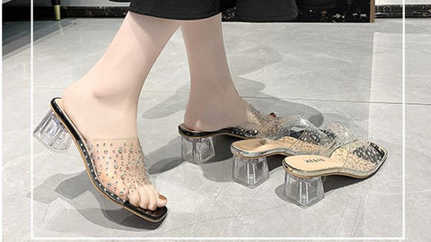 This clear heel slide sandals features peep toe and studded decoration. It makes you more fashion when you take them in leisure time. The heel height is 2.36"(6cm).