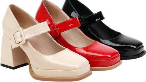 This platform loafers features square toe, buckle strap and chunky heels. The patent leather is very chic to wear. The platform is 0.79"(2cm) high. The block heels height 3.54"(9cm) can elongate your leg and it's easy to keep balance.